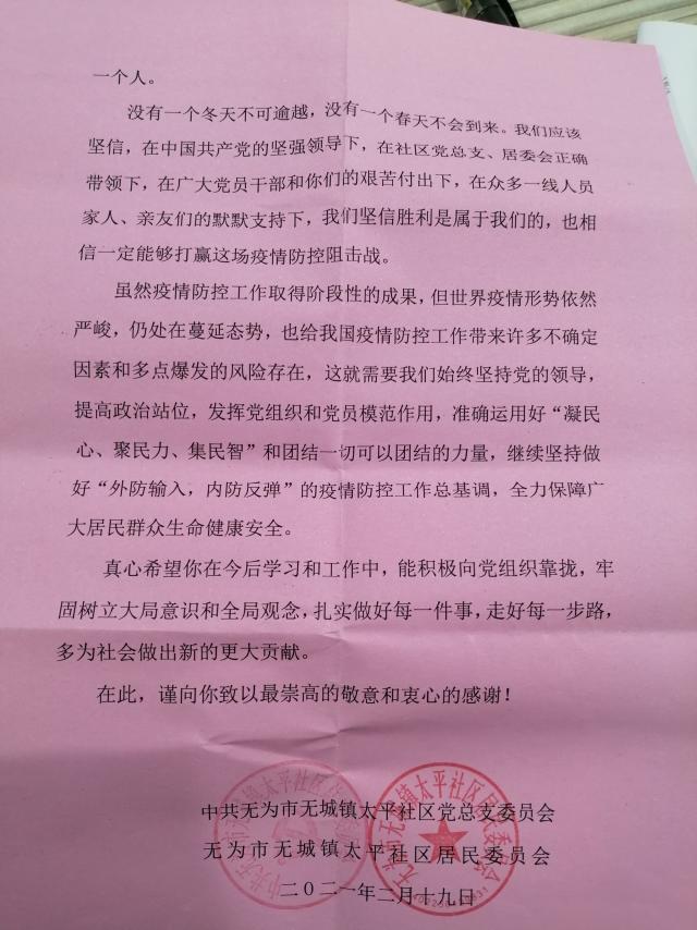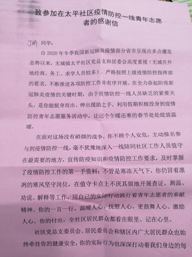 ​在疫情防控的严峻形势下,为大力弘扬“奉献、有爱、互助、进步”的志愿服务精神,寒假期间,公司19工程造价2班丁昕同学积极响应校团委对寒假期间“返家乡”社会实践工作的安排,因社区志愿者人员紧缺,在做好自身防护的同时,第一时间投身于家乡无为市城镇太平社区的疫情防控工作中,与当地志愿者团队其他成员共同抗击疫情,保卫美好家园。