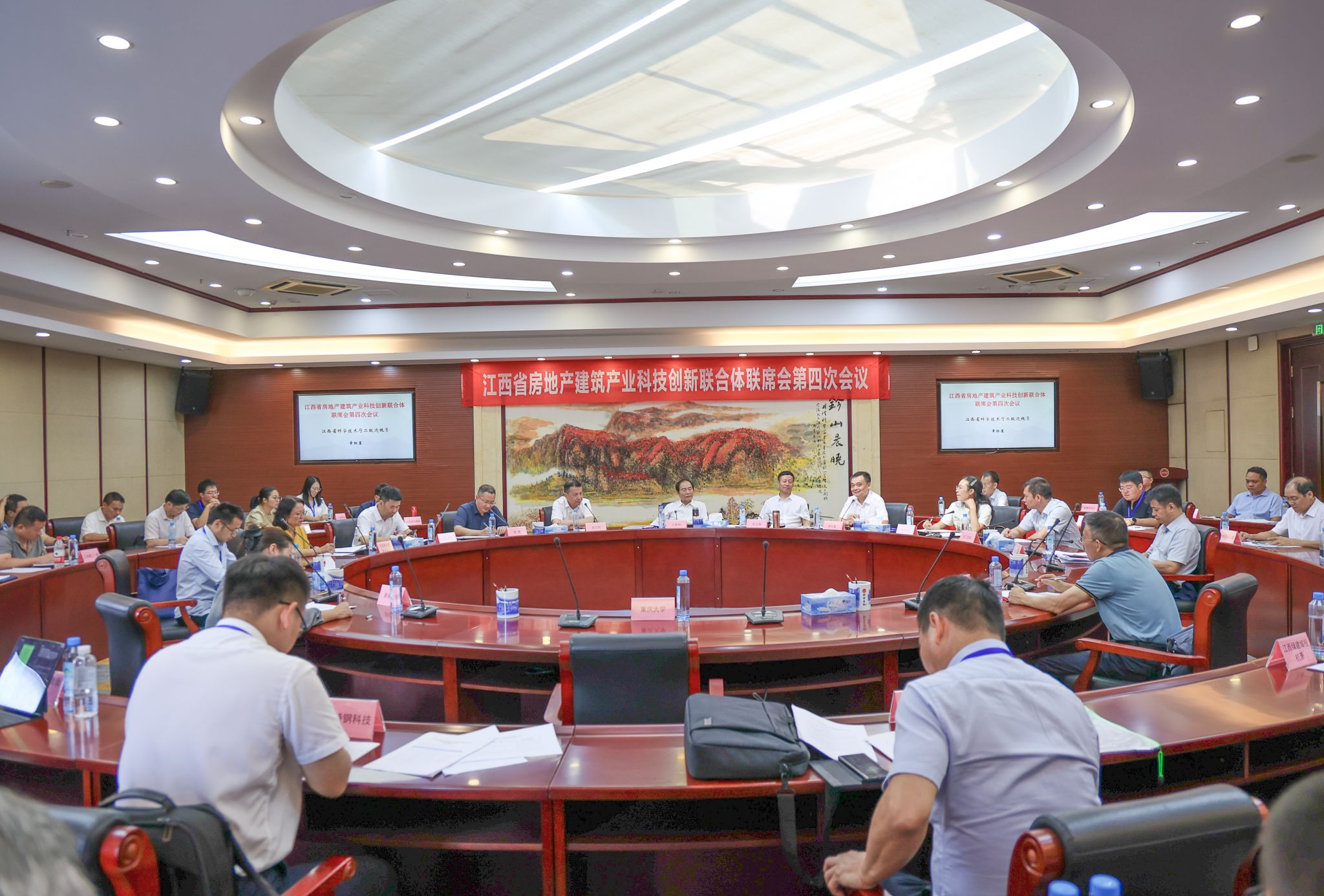 会上,全体参会人员首先审议《江西省房地产建筑产业科技创新联合体 2024 年度工作报告》。报告系统梳理了联合体过去一年的工作成果:立项省级以上纵向课题 40 余项、横向课题百余项,总研发经费突破 2000 万元;制定地方及行业标准 20 余项,申请并授权发明专利 30 余项;攻克重大技术问题 20 余项,推动 10 余项科研成果落地转化,为我省建筑业总产值稳定超万亿、转型升级做出了积极贡献。经参会代表充分审议,报告获一致鼓掌通过。