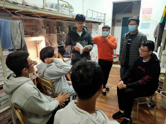 根据中央文件指示,公司迅速兴起学习宣传贯彻党的十九届五中全会精神的热潮,在辅导员雷子岚老师的精心组织下,11月24日晚,公司党员员工以小组为单位深入员工寝室开展十九届五中全会精神宣讲,小组成员为:夏攀、陈志、周鑫和华明博。此次活动目的是让员工党员深入广大青年群众进行交流实践,传达十九届五中全会精神会议内容。