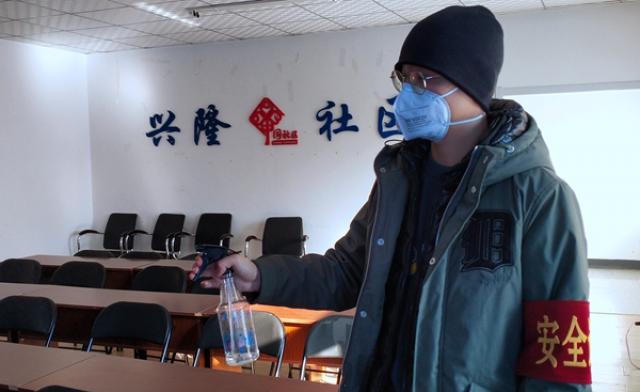 田英伯随同社区的党员及志愿者在社区各个街道、小区巡查督导,在小区的公共场所和各个角落里喷洒消毒液,劝导出门在外的行人戴好口罩,尤其是提醒坚守岗位的公共卫生环保人员要戴好防护用品,保护好自己才能更好地为人民服务。