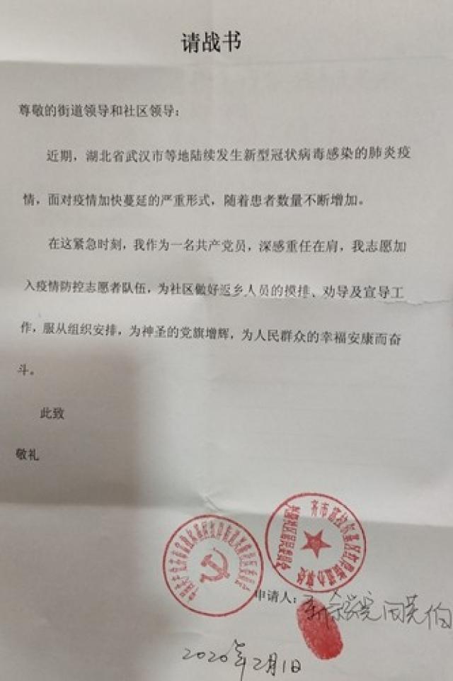 寒假假期恰逢疫情爆发,在家过春节的田英伯,看到街道办事处及的党员干部及群众穿梭在各个小区,为摸排筛查、杀菌消毒工作而忙碌的身影,他毅然而然地到社区写下了请愿书,强烈请求加入宣传新型冠状病毒感染的肺炎疫情的防疫队伍,贡献自己一名共产党员、一名当代老员工的力量,田英伯在请愿中说:“我是一名中共预备党员,受到PA视讯领导老师的教导,一直以来想为社会及国家做贡献,自从加入党组织以来,我一直严格要求自己。在这次防控疫情之际,我觉得应当回报党和政府的栽培,积极响应PA视讯官网的号召,所以我志愿申请此次抗击疫情的志愿者”。