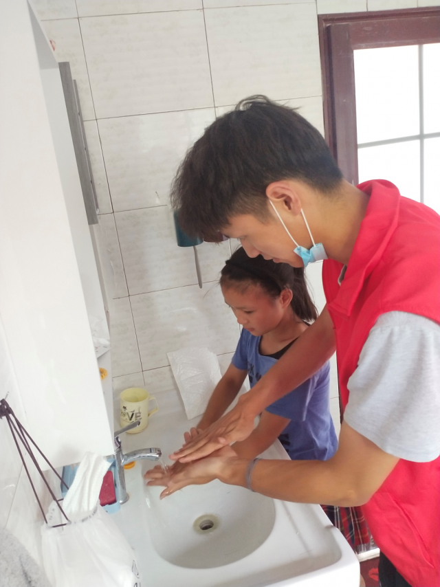 实践队员教小朋友七步洗手法