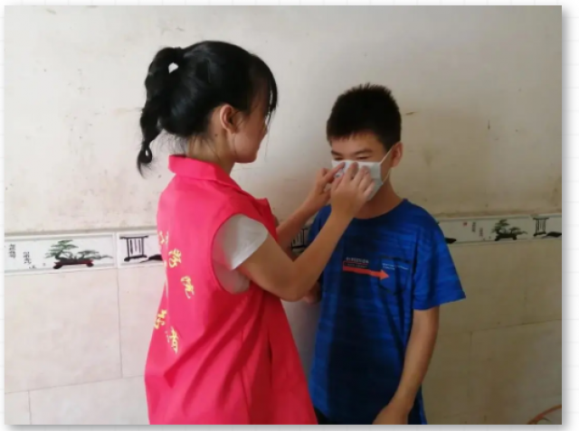 实践队员为小朋友讲解如何正确佩戴口罩