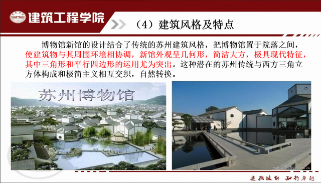 活动中,熊含梦老师向大家分享了我国古代祭祀中最高级别的建筑--孔庙、文庙,并通过大量实景图片对其建筑构成进行了细致的讲解;而柴路路老师围绕苏州博物馆新馆展开讲说,不仅介绍了苏州博物馆传统与现代完美融合的创新式设计理念,同时对其建造技术、造型艺术、育人思想等方面进行了深度剖析;崔丹丹老师则在介绍西柏坡中共中央旧址大院平面布局的基础上将中共中央旧址大院的建筑特点与红色文化层层结合,向同学们传述了“两个务必”的西柏坡精神,勉励大家要满怀信心地克服困难,迎接挑战。
