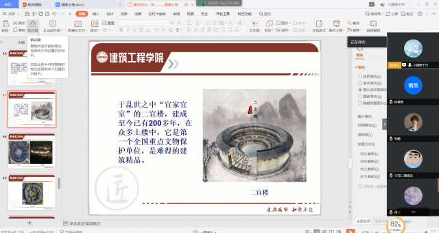 活动中,钟鑫老师深入浅出地介绍了红色建筑-会师楼,并通过详实的图文资料分析了会师楼中一系列革命旧址的建筑特点,同时援引其革命故事深刻诠释了长征精神的丰富内涵,激励大家传承并弘扬红色精神;曾雯琳老师则讲解了大型国际航空综合交通枢纽—北京新机场,着重对其建设进程、建设意义及项目难点加以介绍,同时深入分析了BIM技术在其建设中的创新与应用,展示了我国工匠开拓创新的累累战果;黄颖老师则运用大量详细数据向大家展示了福建土楼在方与圆之间的衍生之路,对其外观发展及内部构造设计进行了深入剖析,并由中国传统建筑的发展道路上升到当代老员工对传统文化的认同感的层次。