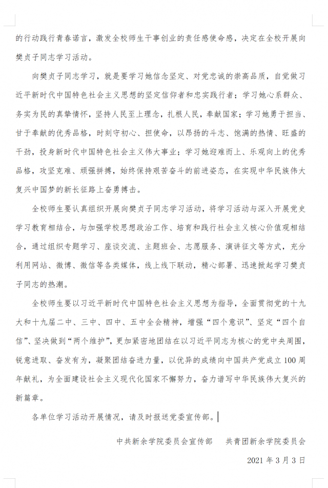 本次开展对樊贞子同志先进事迹的学习活动,让大家看见了中国特色社会主义思想在樊贞子身上的具体体现,也激励了大家在今后的学习生活中始终保持高度的社会责任感,能够迎难而上,以顽强拼搏、艰苦奋斗的姿态奋力前行。