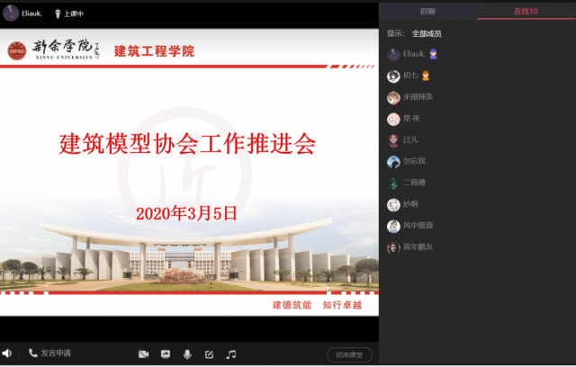 为响应公司“停课不停学”的号召,进一步推进疫情防控形势下的社团工作,3月5日下午,建筑模型协会召开视频工作例会,本次会议由公司团委老师李鹏鹏主持,社团负责人和小组长参加会议。