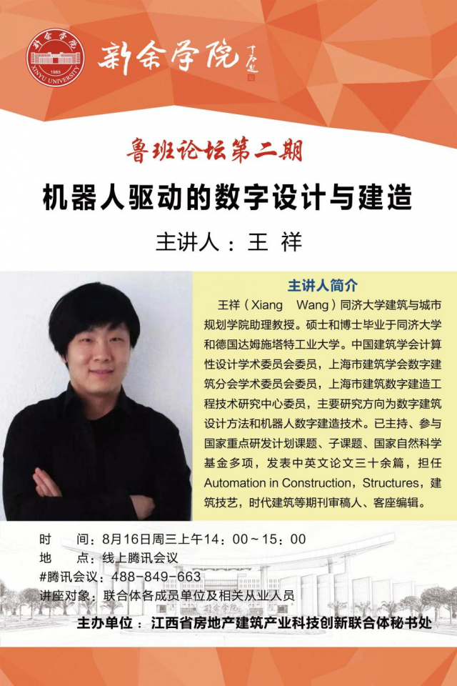 2023年8月16日下午,江西省房地产建筑产业科技创新联合体(以下简称“联合体”)召开鲁班论坛第二期,邀请到了同济大学建筑与城市规划公司王祥教授,联合体成员单位技术人员、中鼎公司第七期全体学员在线参与了此次报告。
