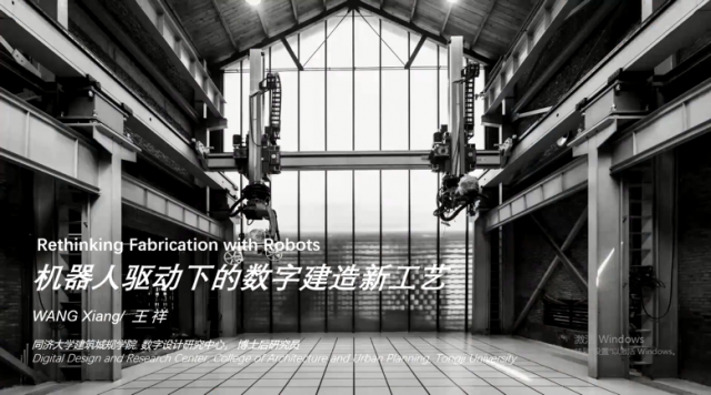 王祥教授报告的主题是《机器人驱动的数字设计与建造》。首先,报告向我们展示了机器人金属弯折、砖构工艺、“竹里”等,其次介绍了性能导向的材料性和建构观,形式、设计、建造的一体化整合,将离散环节整合在一起,同时还介绍了利用机器人进行建造的相关案例,通过视频展示多材料机器人3D打印的桥梁、基于乡村振兴的“云市”项目,空间异形结构的建造,无人机装配建造,最后展示了自主开发的软件——FUROBOT,结合机器人进行幕墙板的安装。